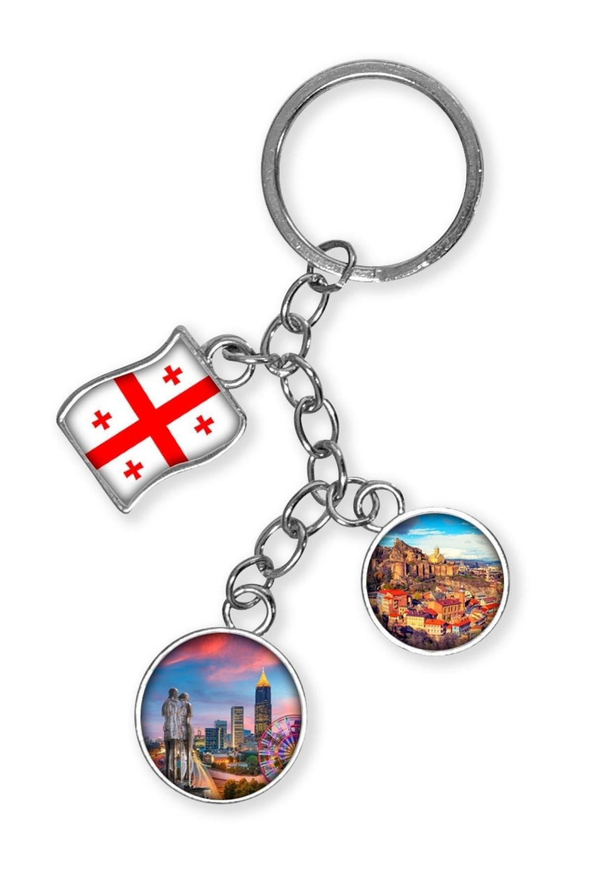 Gürcistan Bayrağı ve Şehir & Simge temalı, metal, üçlü epoksi, çift taraflı canlı baskılı seyahat hatıra anahtarlığıdır.
