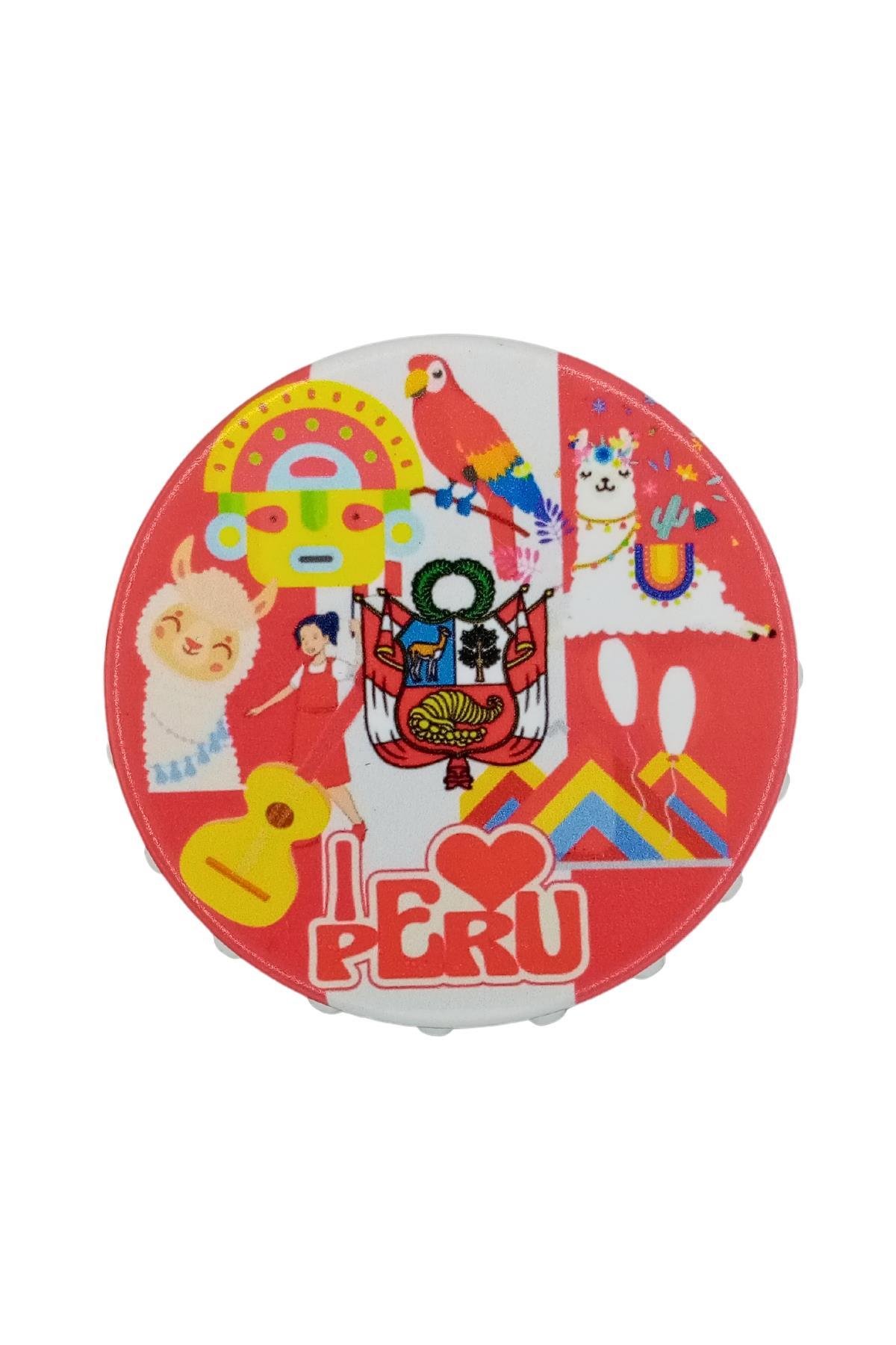 Peru temalı şişe kapağı şeklinde tasarım magnet ve şişe kapağı açacağıdır.