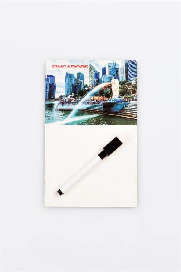 Singapur temalı magnetli ahşap notluk, ahşap üzerine uv baskı tasarım, ön alt kısmına yazı yazılabilir ve silinebilir.