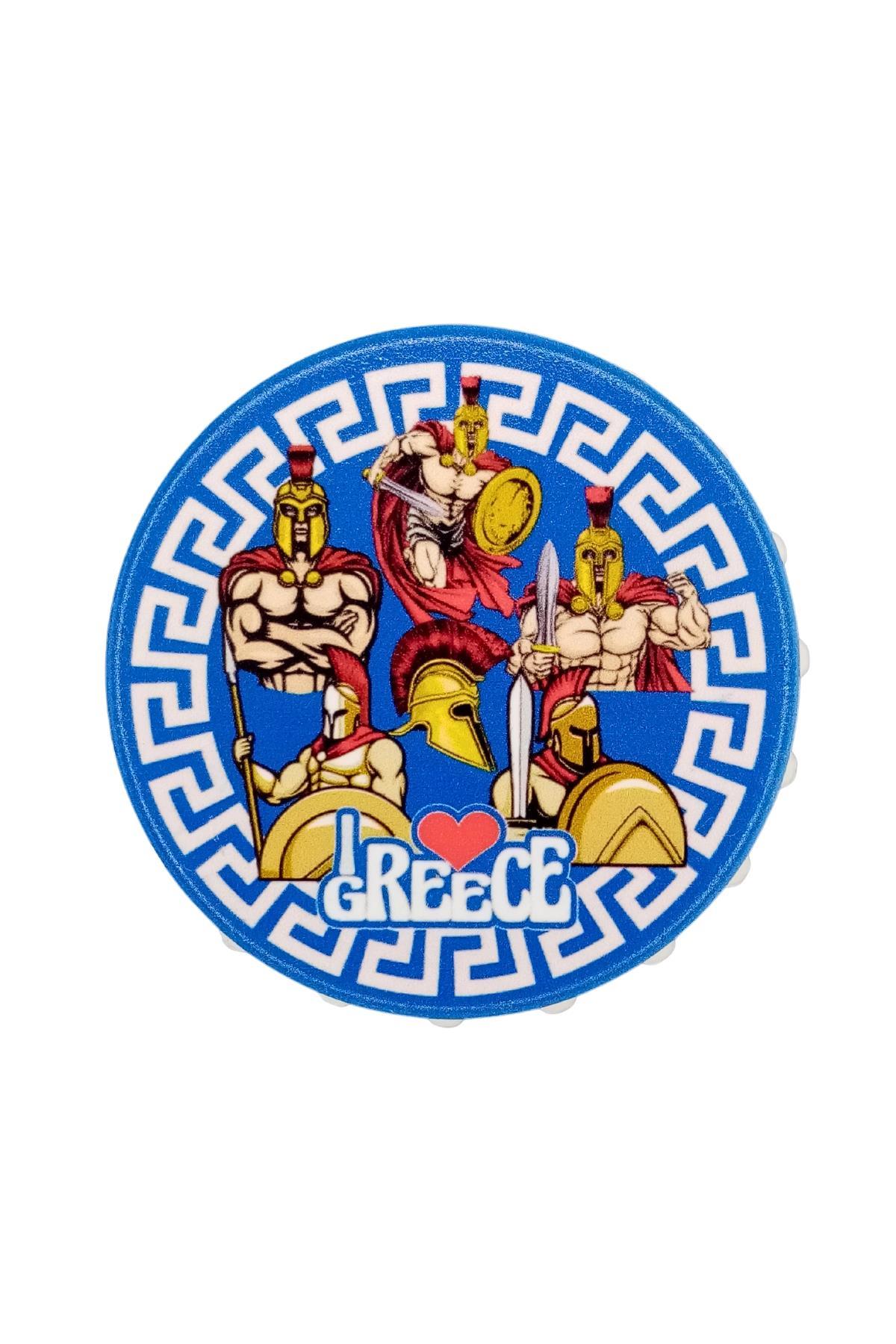 Yunanistan temalı şişe kapağı şeklinde tasarım magnet ve şişe kapağı açacağıdır.